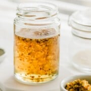 - Strain the osmanthus syrup through a fine mesh sieve into a clean jar or bottle, or include the flowers -- your choice.
